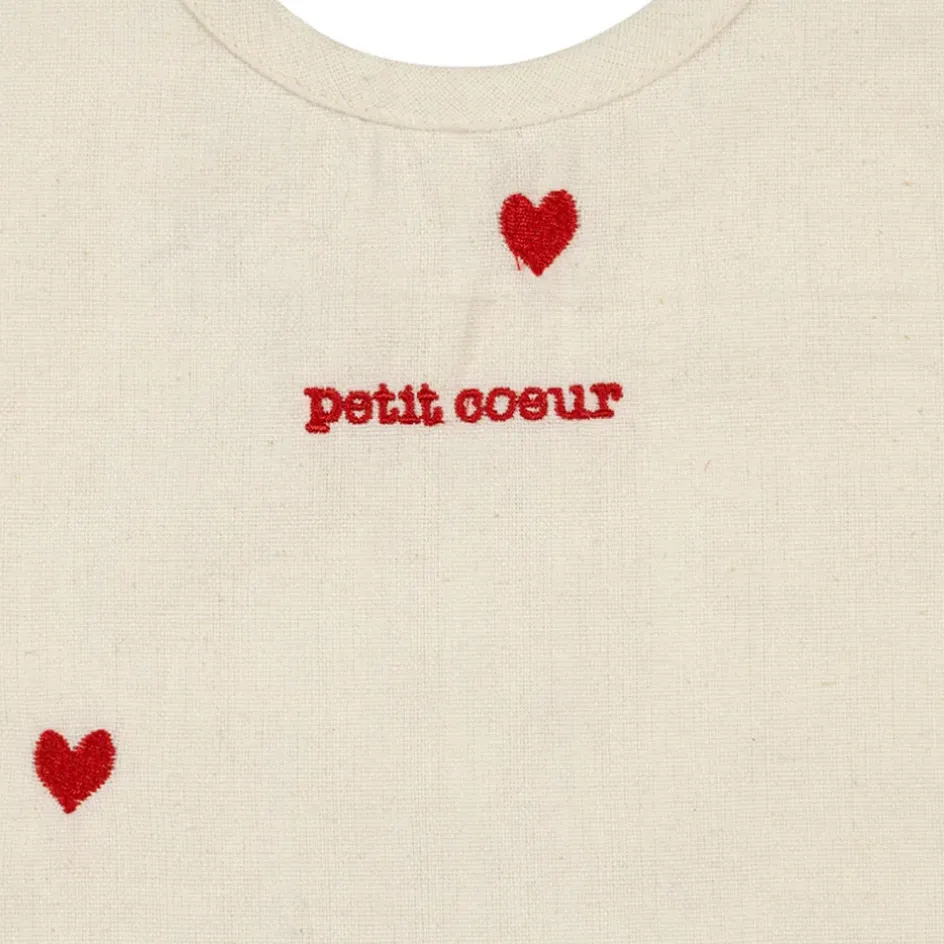 Découvrez le bavoir en coton écru et rouge, un allié indispensable pour les repas avec les tout-petits.