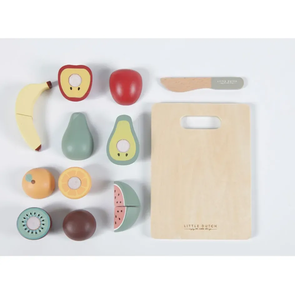 Chaque fruit est divisé en deux parties grâce à des attaches velcro, permettant aux enfants de les découper à l’aide du couteau en bois inclus.