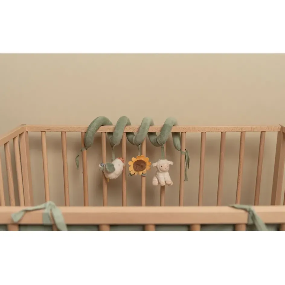 La spirale d’activités est en velours côtelé avec du coton et comporte un petit mouton, un poulet joyeux et une belle tournesol.