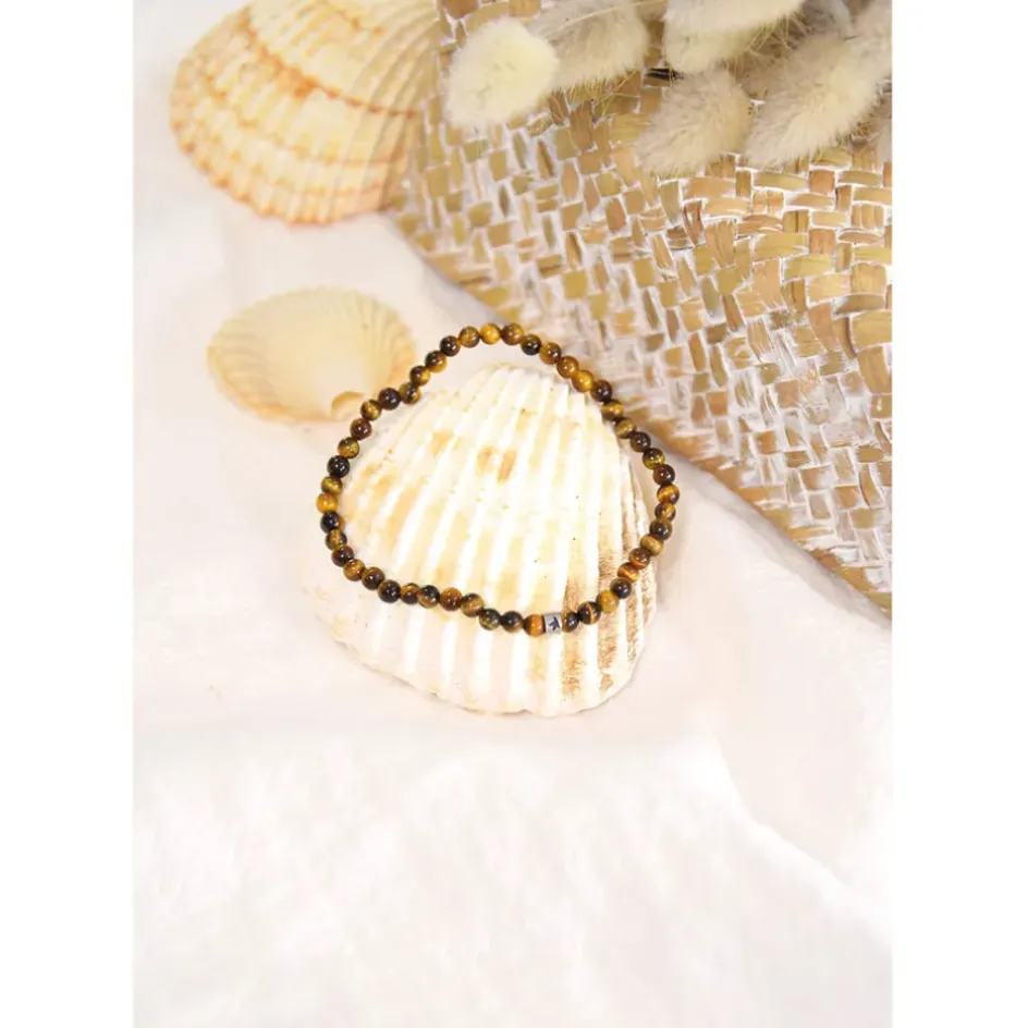 Bracelet élastique composé de perles en pierre naturelle d’oeil de tigre. Pierre de protection, l’œil de tigre crée autour de soi un miroir qui renvoie les énergies négatives. Il aide à dépasser les peurs et redonne confiance en soi.Œil de tigre naturel et perle Omsaé en acier inoxydable. Origine de la pierre : Afrique du Sud. Pierre certifiée par un gemmologue français.
