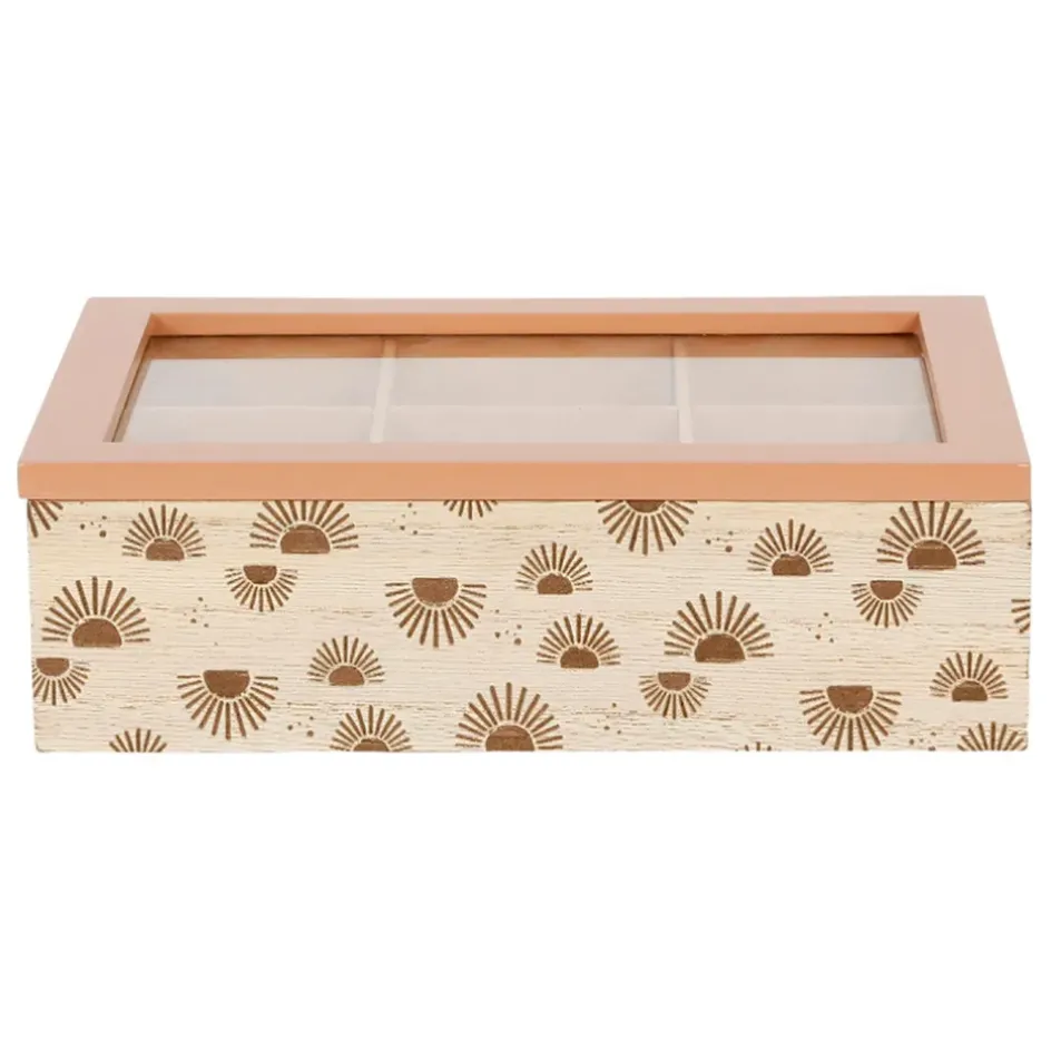 Découvrez notre boîte à thé à 6 compartiments « Sweet Leaves » qui vous charmera par son côté naturel et son magnifique imprimé représentant un couché de soleil.