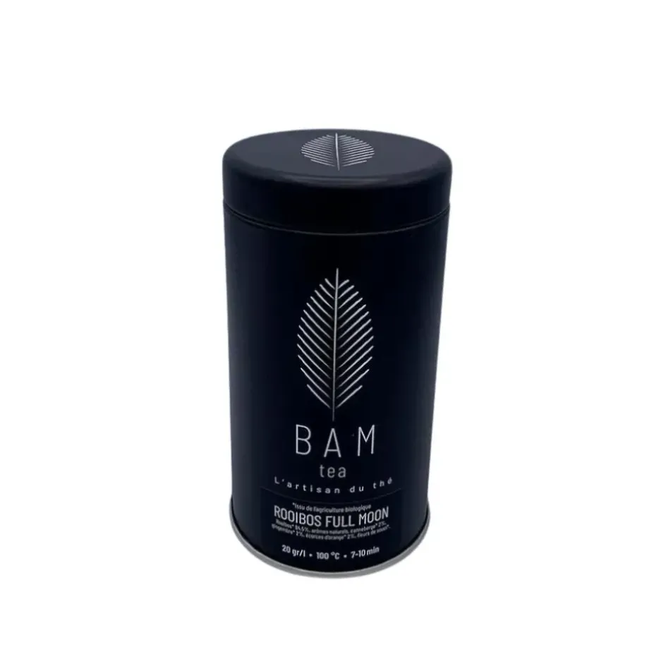Temps d’infusion dans une eau froide: 1 h.Rooibos FULL MOON conditionné dans une Boite métal fabriquée en France.