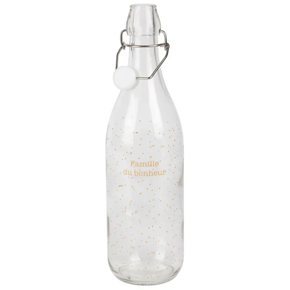 Faites briller votre table avec la bouteille en verre d’une contenance de 1 litre, subtilement rehaussée de détails dorés.