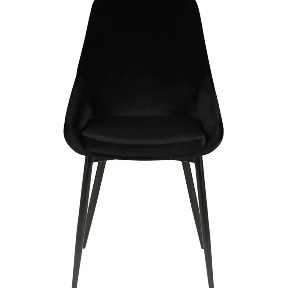 Cette chaise en tissu noir, sera parfaite dans un intérieur moderne et chic.Structure d’assise : contreplaqué, mousse polyuréthane densité 24 kg/m3 Revêtement velours : 100 % polyester Pieds : acier, peinture époxy
