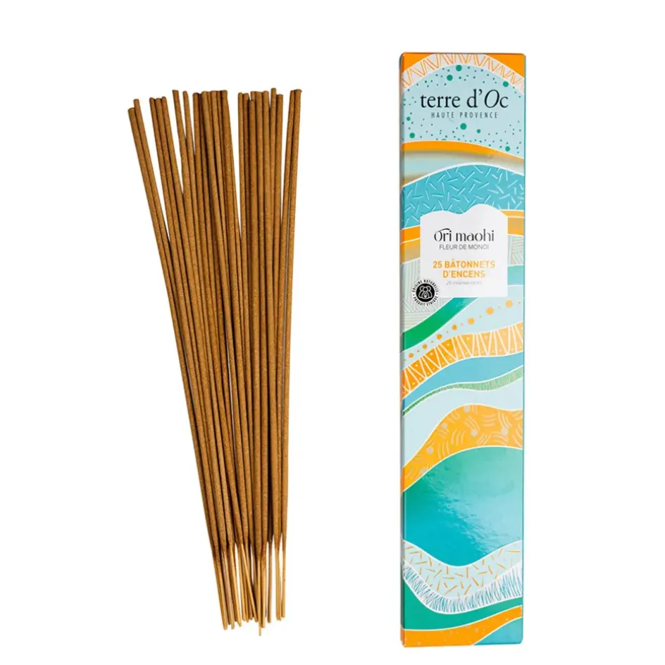 Encens parfumés à la fleur de monoi, Ori Maohi, avec 25 bâtonnets. Créez une ambiance exotique et apaisante avec ces encens au parfum envoûtant de la fleur de monoi.Paraffine + huile de colza + verre