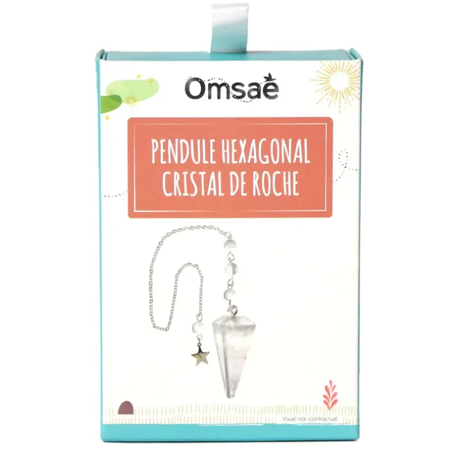 Il est temps de transformer votre espace en un havre de paix et de bien-être.pendule hexagonal et perles en pierre naturelle de cristal de roche. Dimensions pendule : env. 4 cm. Chaîne et charm étoile en acier inoxydable. Longueur chaîne : env. 20 cm. Origine : brésil. Pochon en coton.