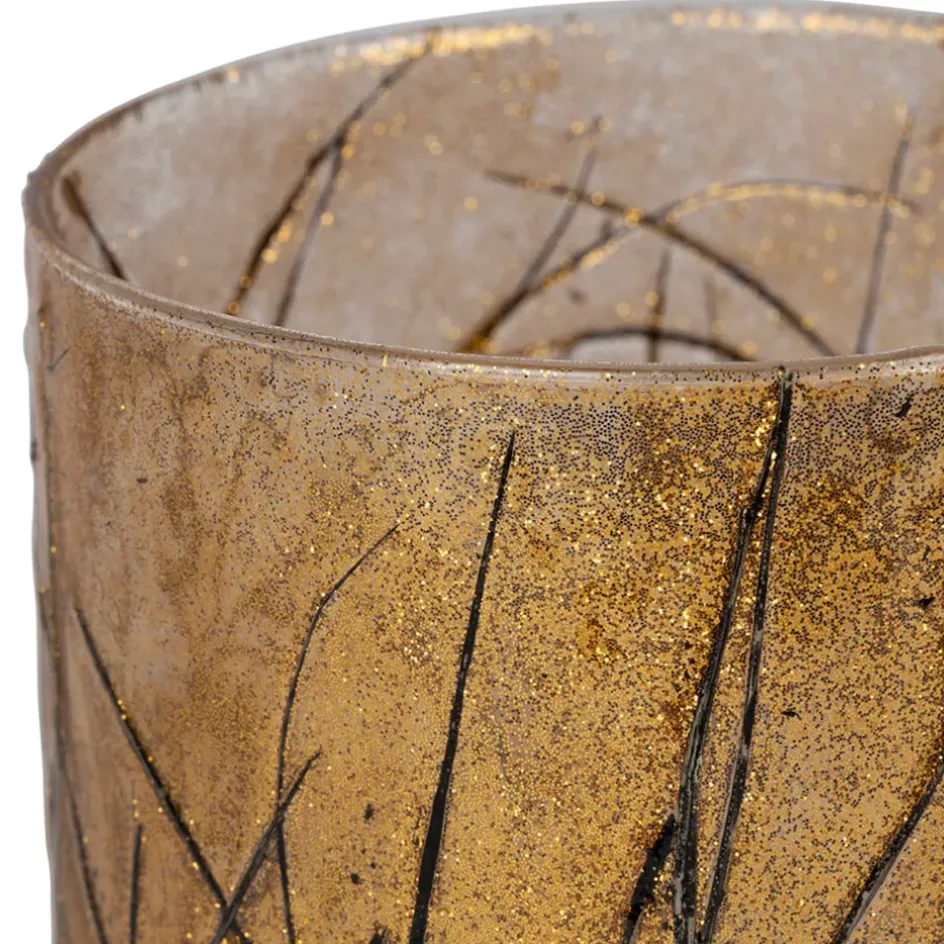 Illuminez votre espace avec notre photophore en verre de 10 cm, magnifiquement agrémenté de détails végétaux dorés et noirs.