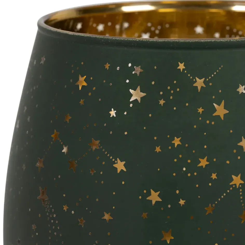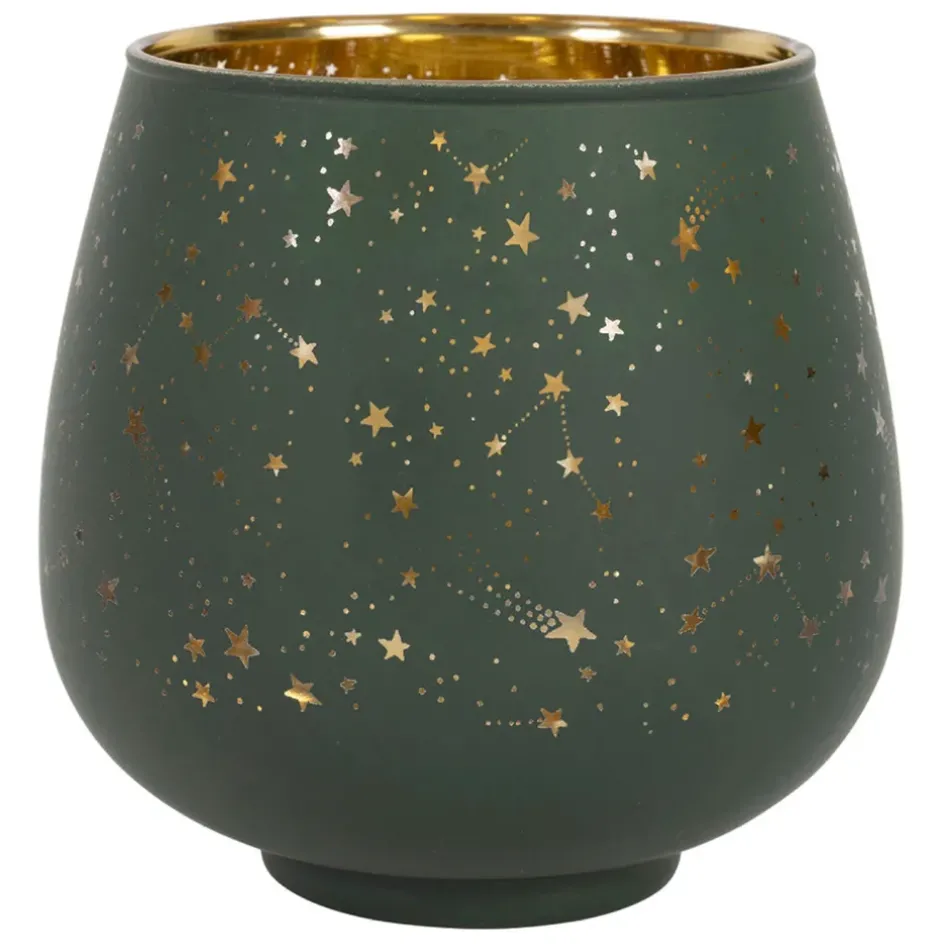 Apportez une touche de magie tropicale à votre intérieur avec ce magnifique photophore en verre vert et doré.