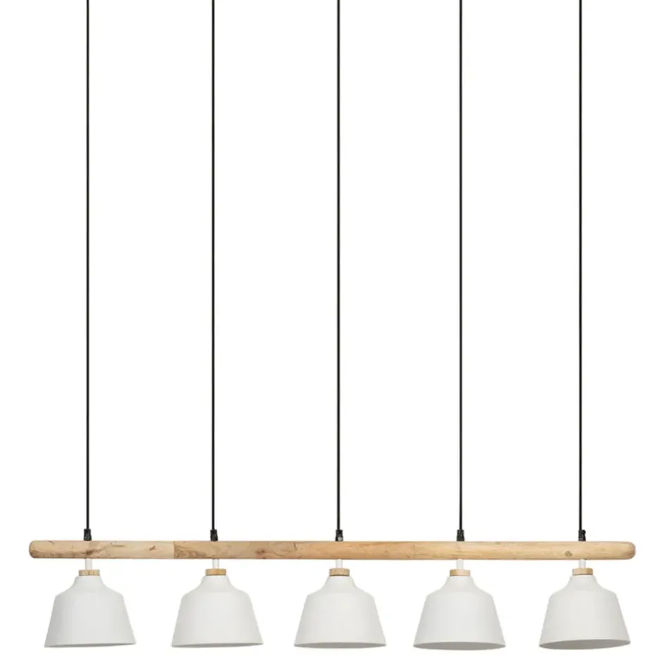 Découvrez l’alliance parfaite entre design contemporain et matériaux naturels avec cette suspension équipée de cinq lampes, mélangeant habilement le fer et le manguier blanc.