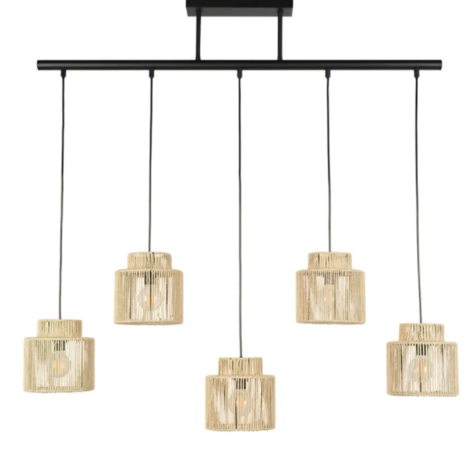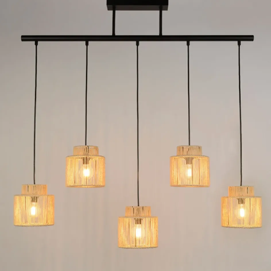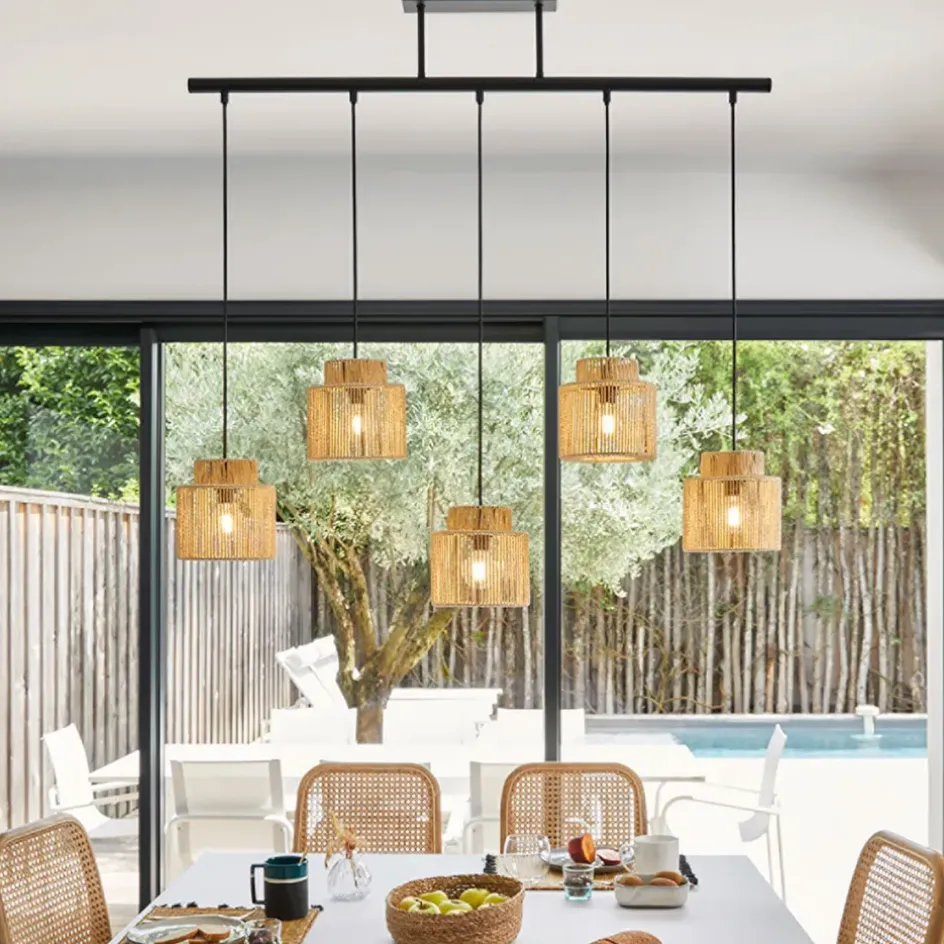 Les cinq lumières suspendues créent une ambiance chaleureuse et invitante, idéale pour le salon ou la salle à manger.