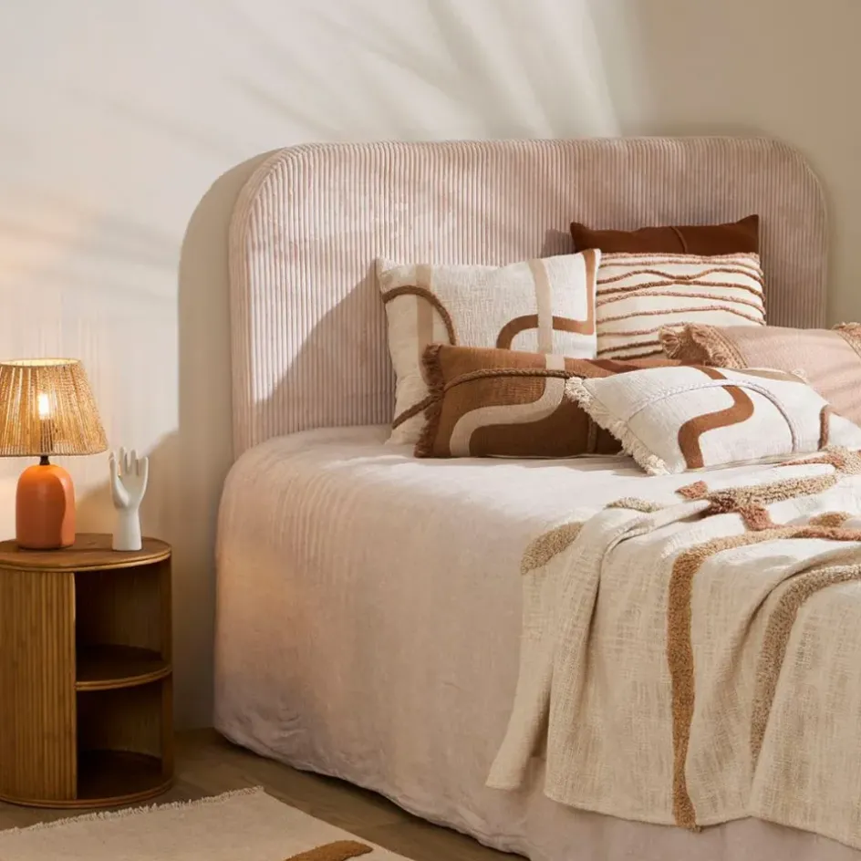 Découvrez comment transformer votre chambre à coucher avec cette magnifique tête de lit en tissu côtelé et hévéa écru de dimensions 440x100cm.