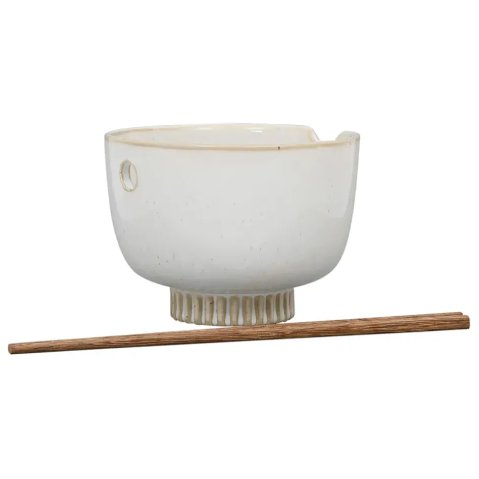 Découvrez notre magnifique bol en grès blanc et ses belles baguettes d’un diamètre de 14 cm.