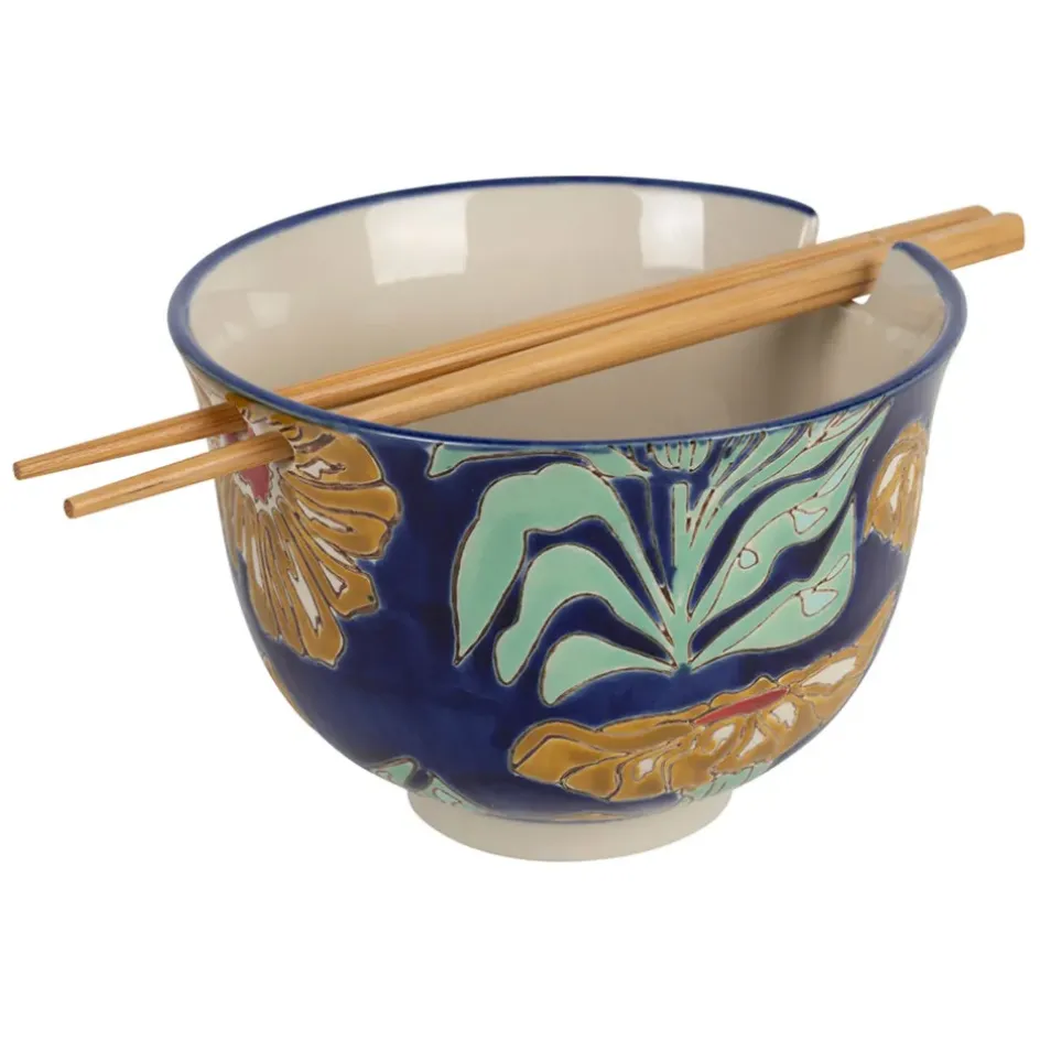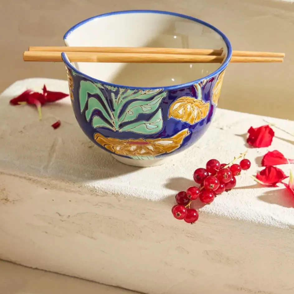Découvrez un ensemble idéal pour égayer vos repas grâce à ce bol en grès accompagné d’un couvercle en bambou et de baguettes multicolores.