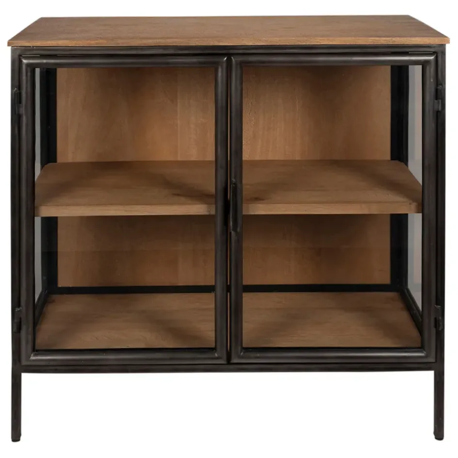 Les deux portes en verre, encadrées de fer, ajoutent une note moderne et industrielle, permettant de voir subtilement l’intérieur tout en gardant vos objets protégés.