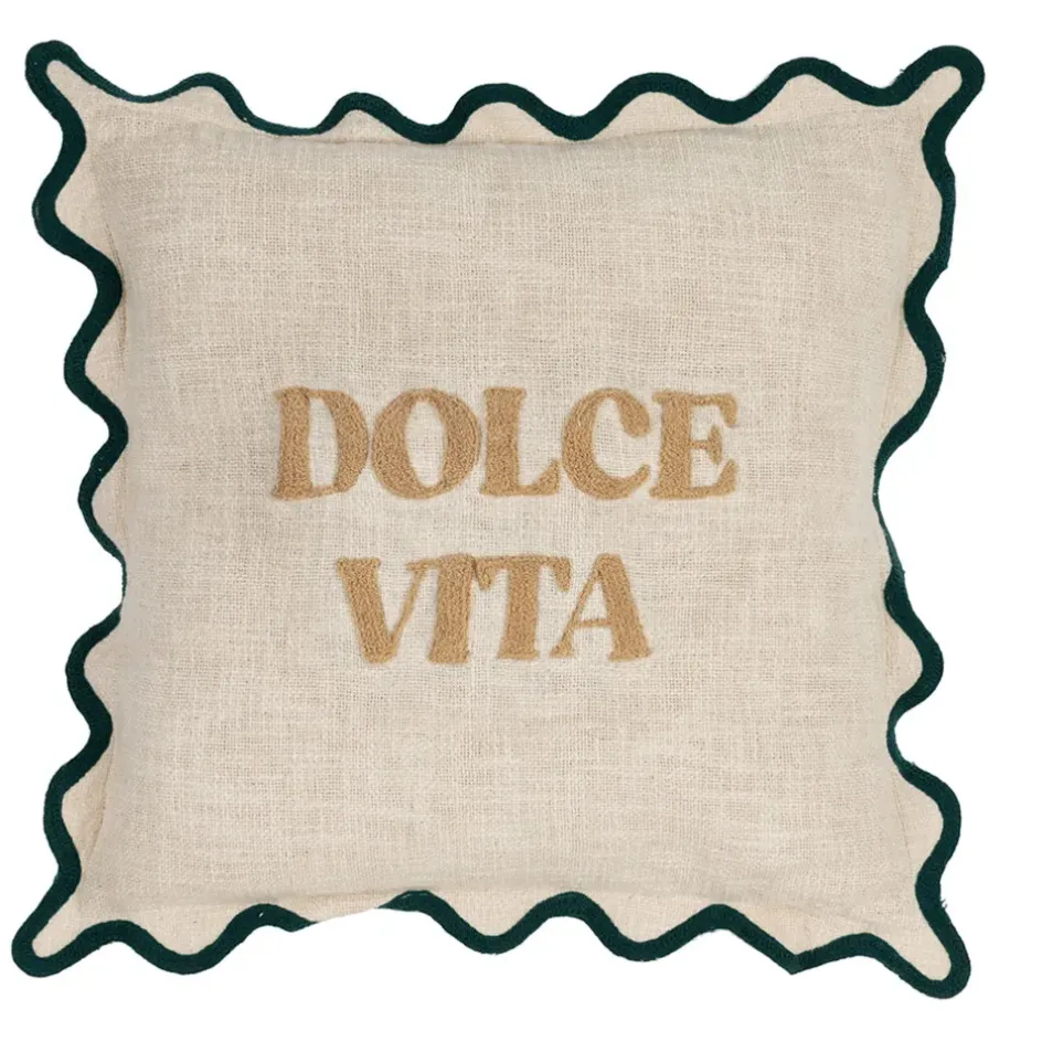 Cette housse de coussin brodée « Dolce Vita » en coton beige et émeraude est une véritable invitation à la douceur et à la convivialité.