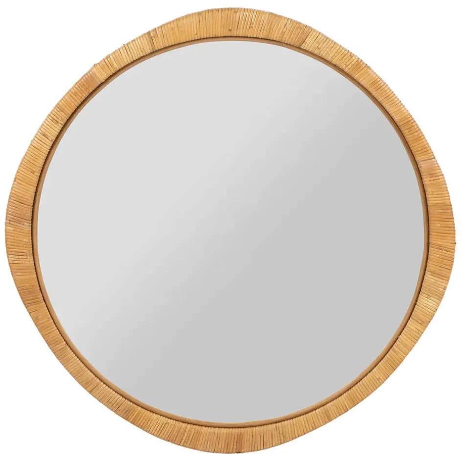 Découvrez notre magnifique miroir rond en rotin d’un diamètre de 87 cm.