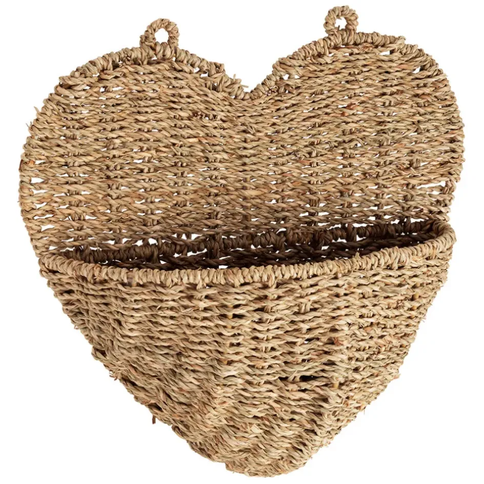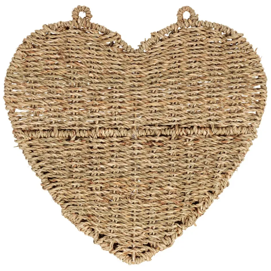 Découvrez ce magnifique panier en forme de cœur, réalisé en chaumière naturelle, mesurant 33x32cm.