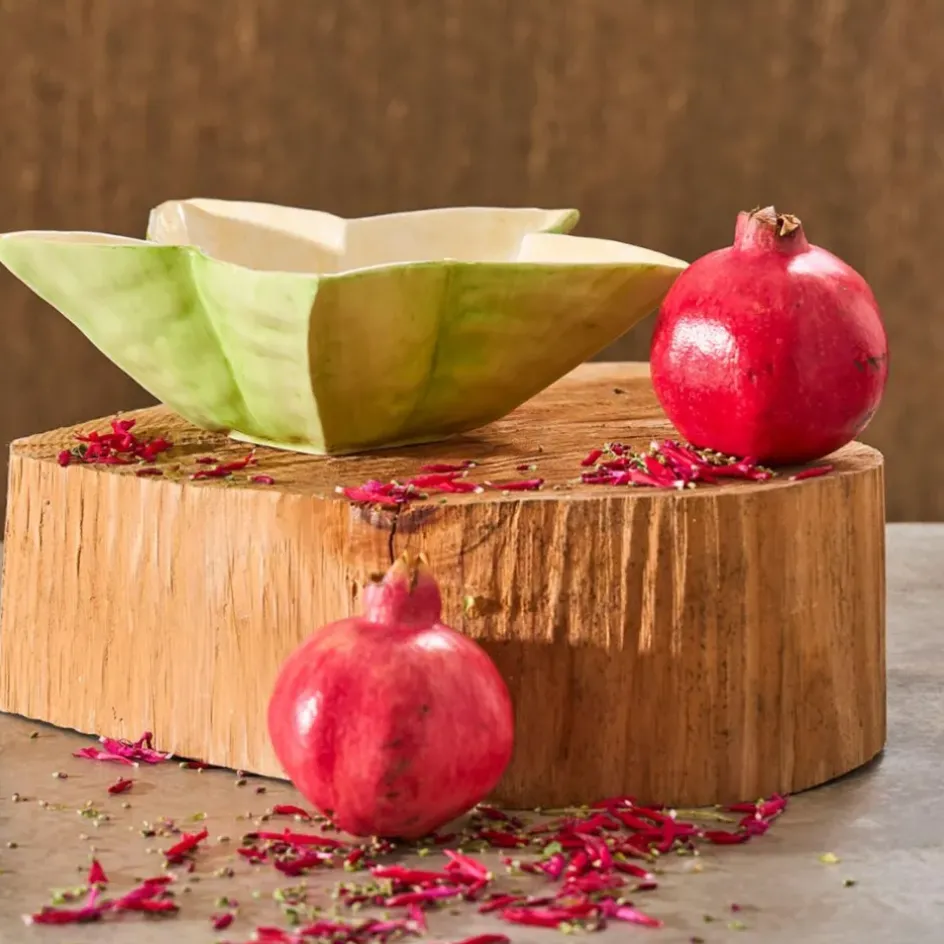 Ce bol en dolomite suggère une journée ensoleillée au bord de la mer avec ses nuances vibrantes de vert et de jaune.